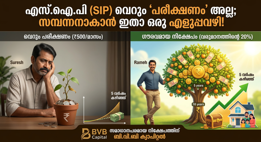 എന്നാൽ നിക്ഷേപത്തിന്റെ കാര്യത്തിൽ മലയാളി പലപ്പോഴും ചെയ്യുന്നത് ഈ ‘രണ്ട് കല്ല് വെച്ച് നോക്കുന്ന’ പണിയാണ്. പലരും പറയും, “ചേട്ടാ, നമുക്ക് ഒരു 500 രൂപയുടെ എസ്‌.ഐ.പി (SIP) തുടങ്ങാം, ഒരു അഞ്ചു വർഷം ഒന്ന് ടെസ്റ്റ് ചെയ്ത് നോക്കട്ടെ. ലാഭമുണ്ടെങ്കിൽ തുക കൂട്ടാം.” സത്യം പറയട്ടെ, വലിയ തുക നിക്ഷേപിക്കാൻ ശേഷിയുണ്ടായിട്ടും വെറും 500 രൂപയിൽ ഈ അഞ്ചു വർഷം ഒതുങ്ങിനിൽക്കുന്നത് നിങ്ങളുടെ ജീവിതത്തിലെ ഏറ്റവും വിലപ്പെട്ട അഞ്ചു വർഷങ്ങൾ പാഴാക്കുന്നതിന് തുല്യമാണ്.